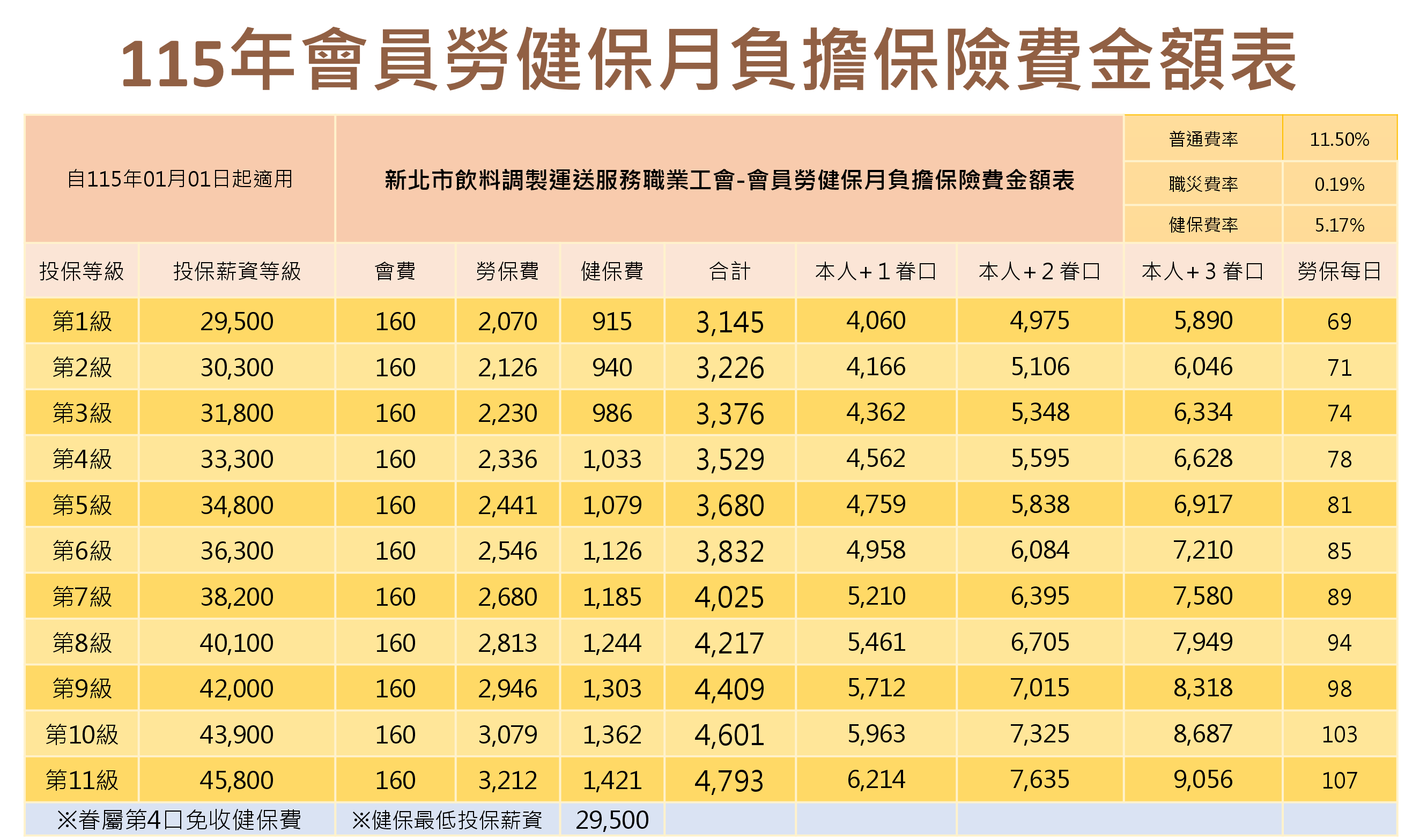 📢 因應115年1月1日起最低工資調整,勞保投保薪資分級表同步修正: