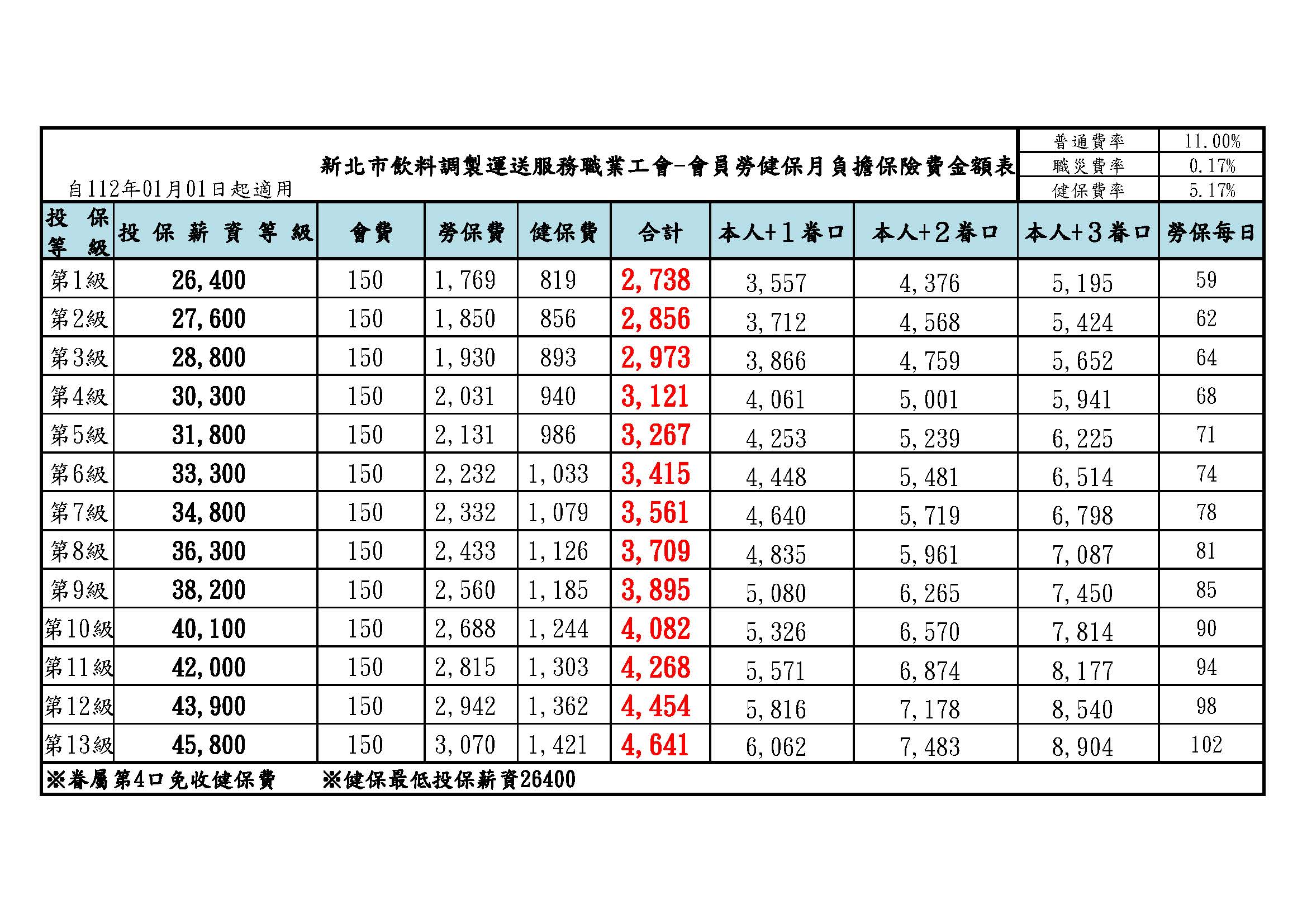 #新北飲料工會112年會員勞健保月負擔保險費金額表